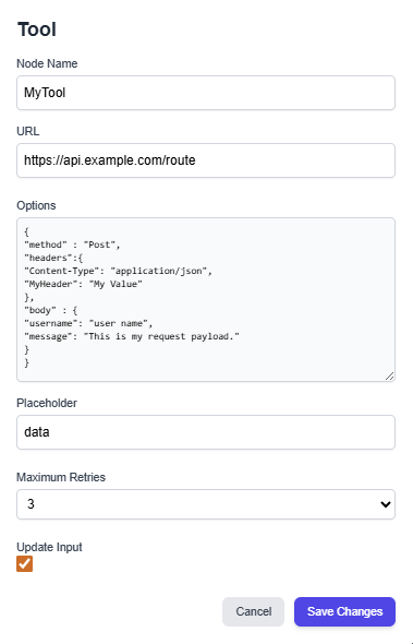 bodyattribute of Options. - Repetitions — max retries until the tool accepts the input. The tool supposed to process AI Agents inputs, if the processing succeeded the tool supposed to respond with a successful HTTP response, otherwise the platform will ask the AI Agent to fix its results and then re-request the tool again.